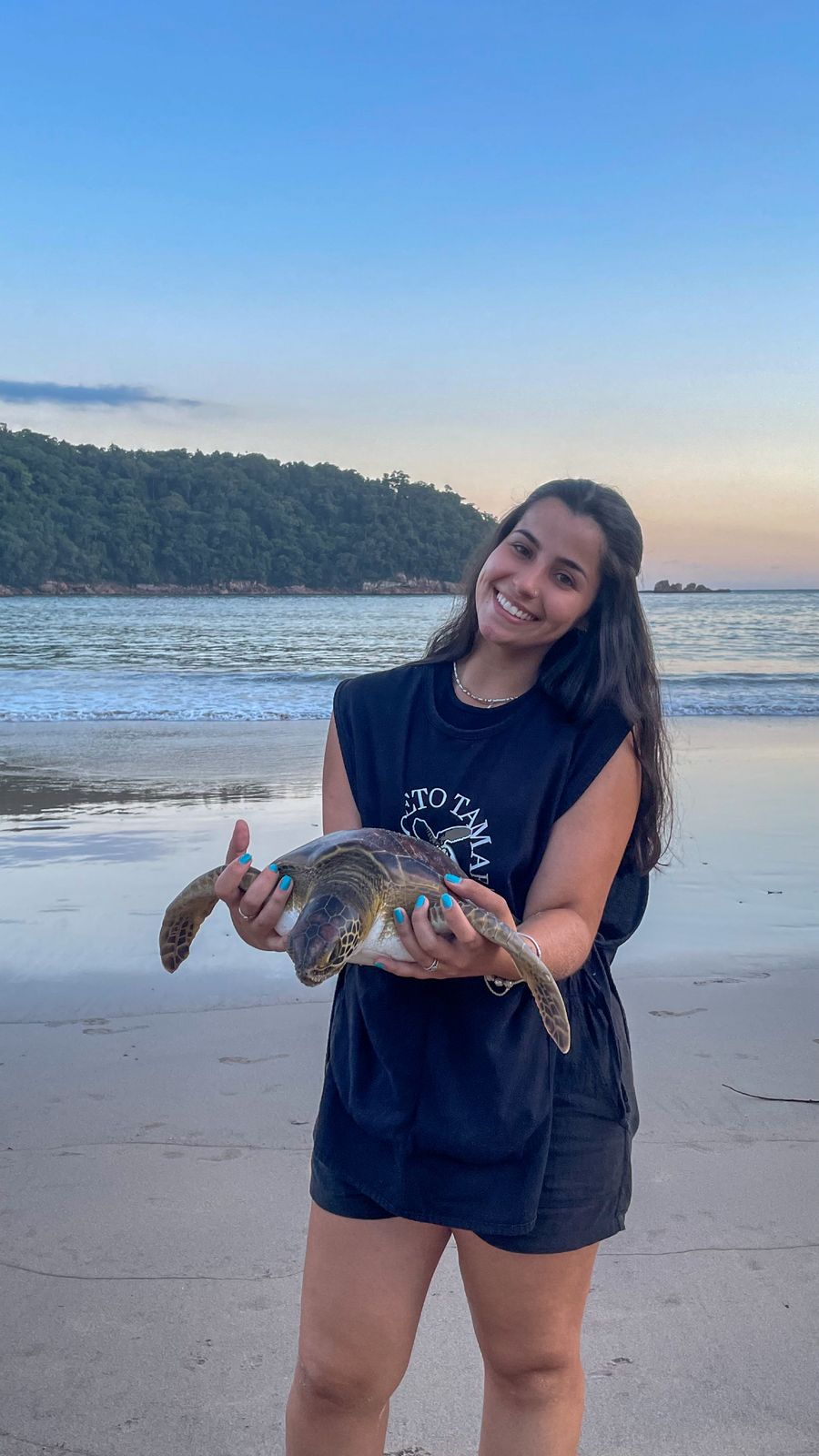 “Posteriormente, realizei estágio no Projeto Tamar de Ubatuba, com atividades de educação ambiental e reabilitação de tartarugas marinhas. Atualmente, estou estagiando no Projeto Tamar do Espírito Santo, atuando no monitoramento reprodutivo das tartarugas marinhas.  No litoral capixaba é a principal área de desova do país e onde encontramos a tartaruga-de-couro, espécie ameaçada de extinção, o que torna essa experiência ainda mais significativa para minha formação”, relata.