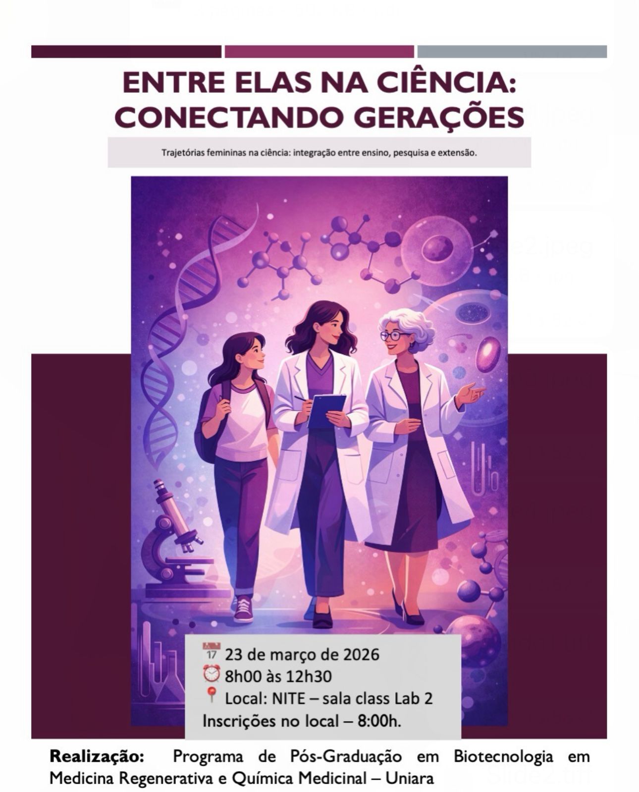 O Programa de Pós-Graduação em Biotecnologia em Medicina Regenerativa e Química Medicinal – PPGB-MRQM da Universidade de Araraquara – Uniara promove o evento gratuito “Entre Elas na Ciência: Conectando Gerações – Trajetórias femininas na ciência: integração entre ensino, pesquisa e extensão” nesta segunda-feira, dia 23 de março, das 8h às 12h30, no Núcleo de Inovação, Tecnologia e Empreendedorismo – NITE (rua Carlos Gomes, 1217, no Centro). Os interessados devem se inscrever no dia do evento e haverá emissão de certificado aos participantes.