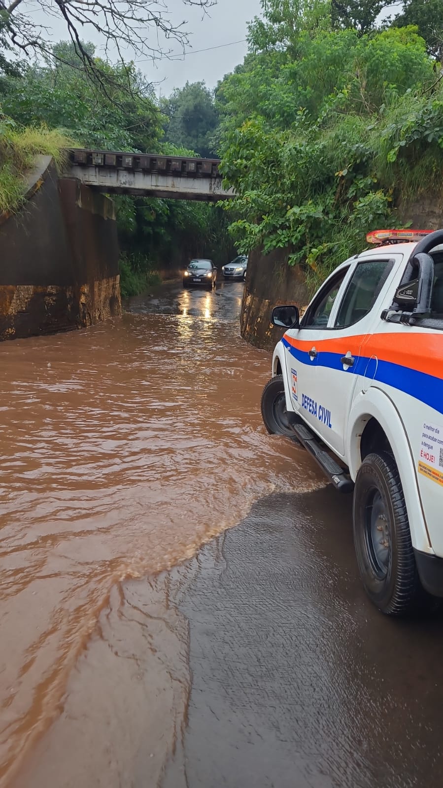 Na Avenida Maurício Galli, três veículos apresentaram pane elétrica devido ao alagamento. Com apoio da Defesa Civil e dos agentes de trânsito, os carros foram retirados por guincho para manutenção.