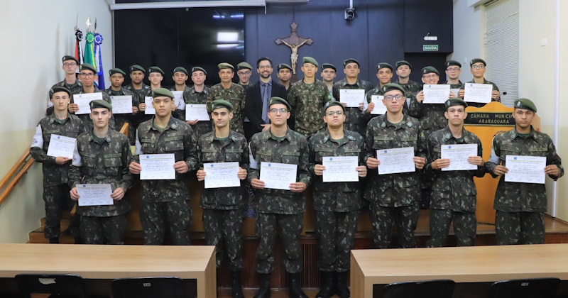 O Plenário da Câmara recebeu na manhã da quinta-feira (6), mais uma edição da entrega do “Diploma Valor Militar”, que desde o ano 2000 reconhece os melhores atiradores e monitores do Tiro de Guerra de Araraquara (TG 02-002).