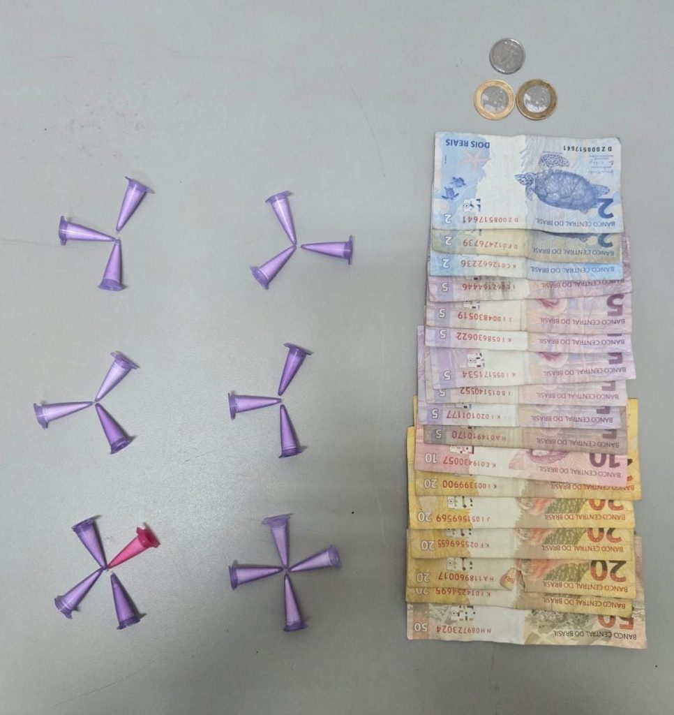 A equipe logrou êxito em abordar apenas o indivíduo K., defronte ao nº 185 da referida avenida. Em busca pessoal, realizada diante de fundada suspeita, foi localizado no bolso de sua bermuda 06 (seis) microtubos contendo substância em pó de coloração branca, com características análogas à cocaína, bem como a quantia de R$ 203,50 (duzentos e três reais e cinquenta centavos) em dinheiro, assim distribuídos:
