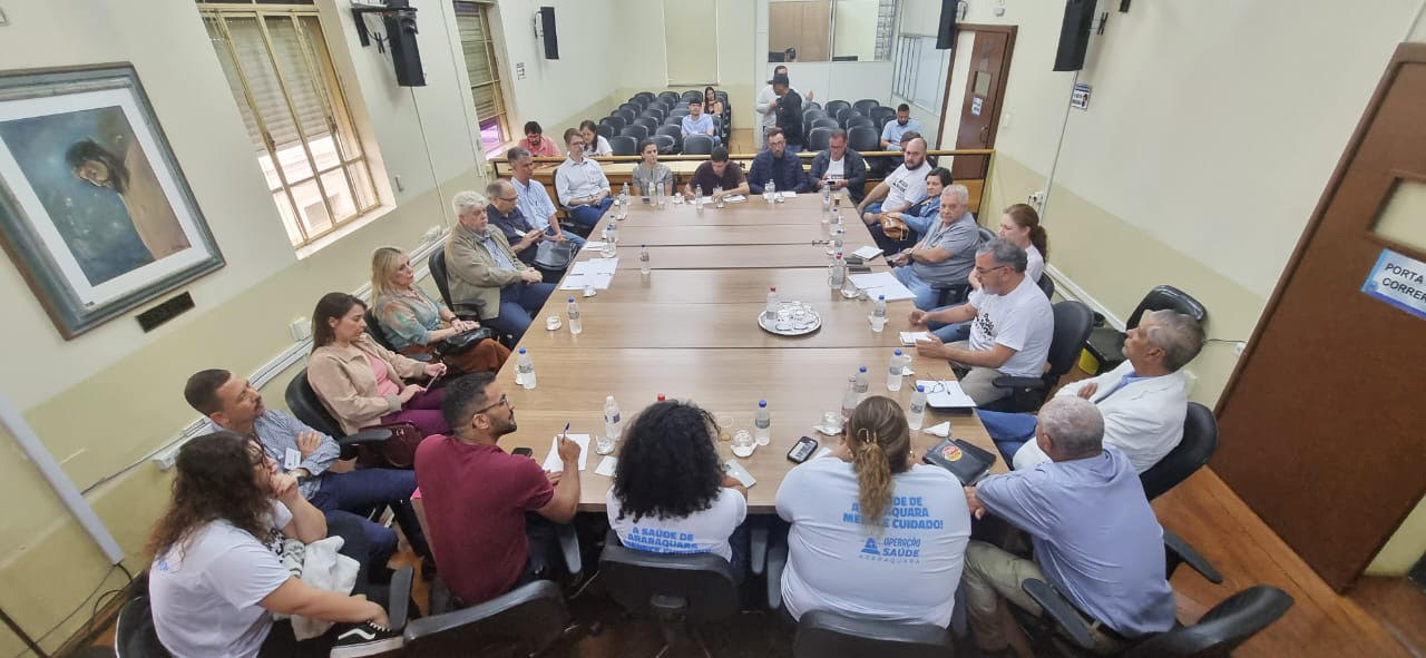 Na tarde desta segunda-feira (13), o plenário da Câmara Municipal de Araraquara recebeu a primeira reunião da frente de trabalho “Operação Saúde”, uma iniciativa conjunta dos vereadores Alcindo Sabino, Aluisio Boi, Fabi Virgílio, Filipa Brunelli, Guilherme Bianco, Marcão da Saúde, Maria Paula e Paulo Landim, e das deputadas estaduais Thainara Faria e Márcia Lia.