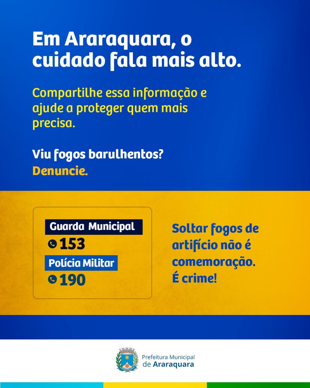 Já o uso de fogos de artifício ruidosos que excedam os níveis de som permitidos é crime, descrito na Lei 899/2019 do município de Araraquara e da Lei Estadual 17.389/2021. Os fogos de artifício representam grande incômodo para várias pessoas, principalmente para idosos, enfermos, crianças e autistas, além de assustar os animais.